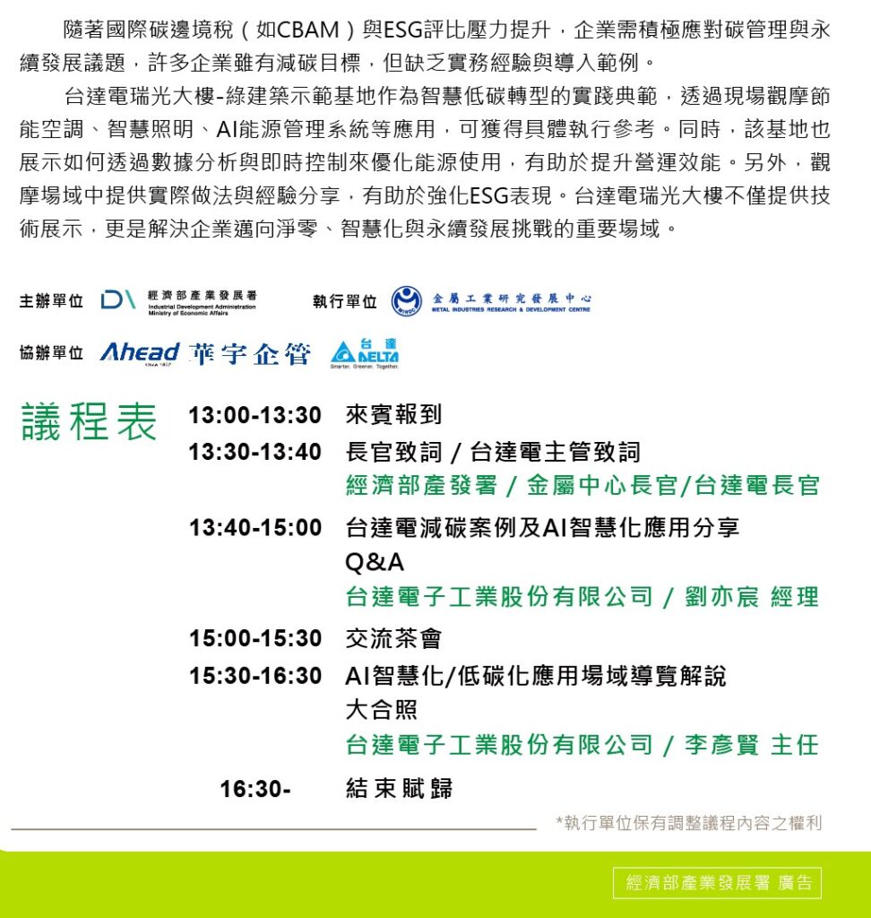 本活動由經濟部產發署主辦,華宇企管與台達電協辦,特別安排參訪台達電綠建築示範基地,實地觀摩AI能源管理、節能設備應用。並邀請顧問與企業代表分享減碳導入經驗,讓企業在減碳之路上能一往無前。